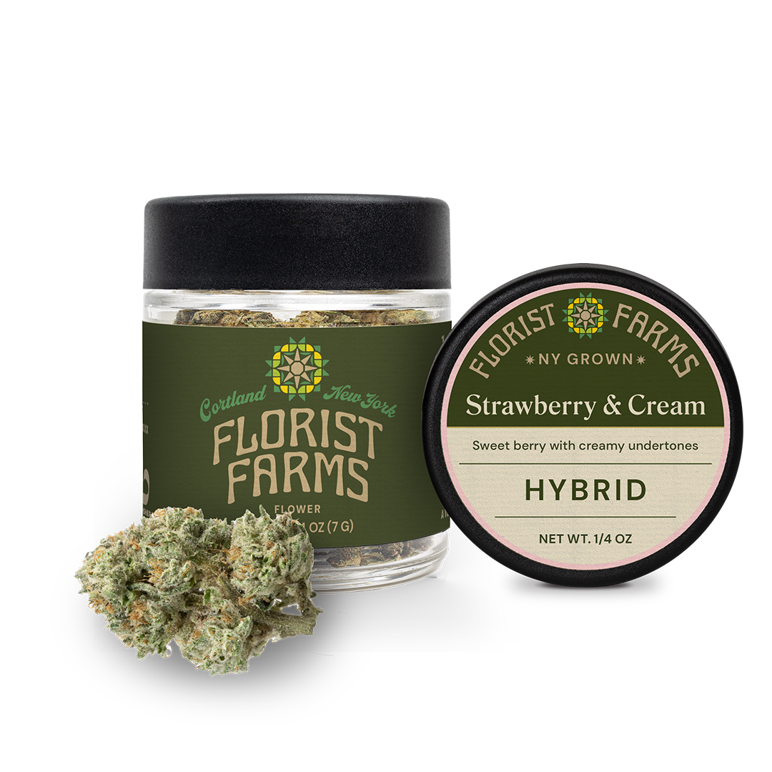 Experience the exquisite quality of the Strawberry and Cream strain with Florist Farms’ generous quarter-ounce (7g) jar of premium flower. Our unwavering commitment to excellence begins at our farm in Cortland, New York, where every gram is cultivated with meticulous care and integrity.